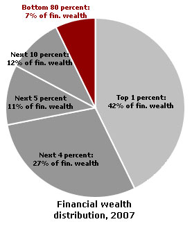 1. The Top 1 Percent Of Americans Owns 40 Percent Of The Nation’s Wealth: As Nobel Laureate Joseph Stiglitz points out, the richest 1 percent of Americans now own 40 percent of the nation’s wealth. Sociologist William Domhoff illustrates this wealth disparity using 2007 figures where the top 1 percent owned 42 percent of the country’s financial wealth (total net worth minus the value of one’s home). How much does the bottom 80 percent own? Only 7 percent: